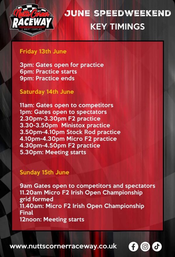 Nutts Corner Raceway have published a timetable for the 2025 BriSCA F2 British & Irish Open Championships June Speed-weekend (see graphic below).